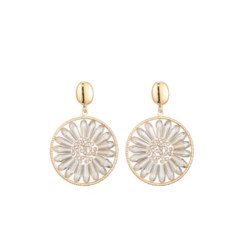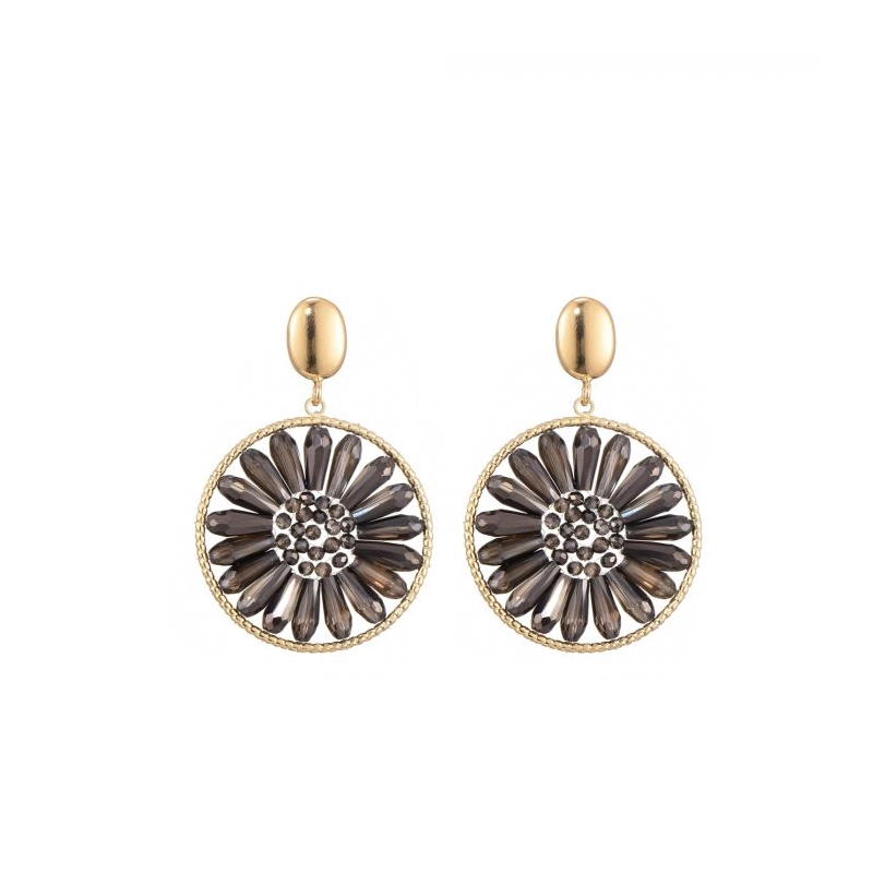 De oorbellen zijn versierd met glazen kristallen in een veelzijdige kleurenpalet, waaronder zwart, bruin, rood, beige, groen en camel.