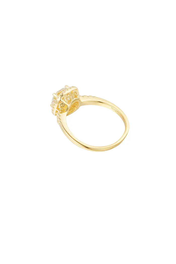 Deze elegante ring is versierd met een grote moissaniet steen, omringd door kleine zirkonium steentjes.